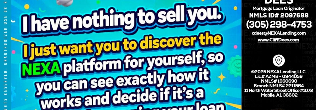 Hi, my name is Cliff Dees. I’m a Loan Officer with NEXA Lending LLC., offering personalized mortgage solutions, fast customized quotes, great rates and service with integrity.