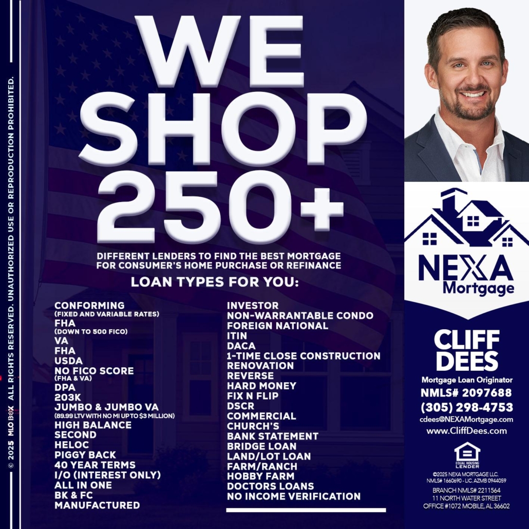 Hi, my name is Cliff Dees. I’m a Loan Officer with NEXA Mortgage LLC., offering personalized mortgage solutions, fast customized quotes, great rates and service with integrity.